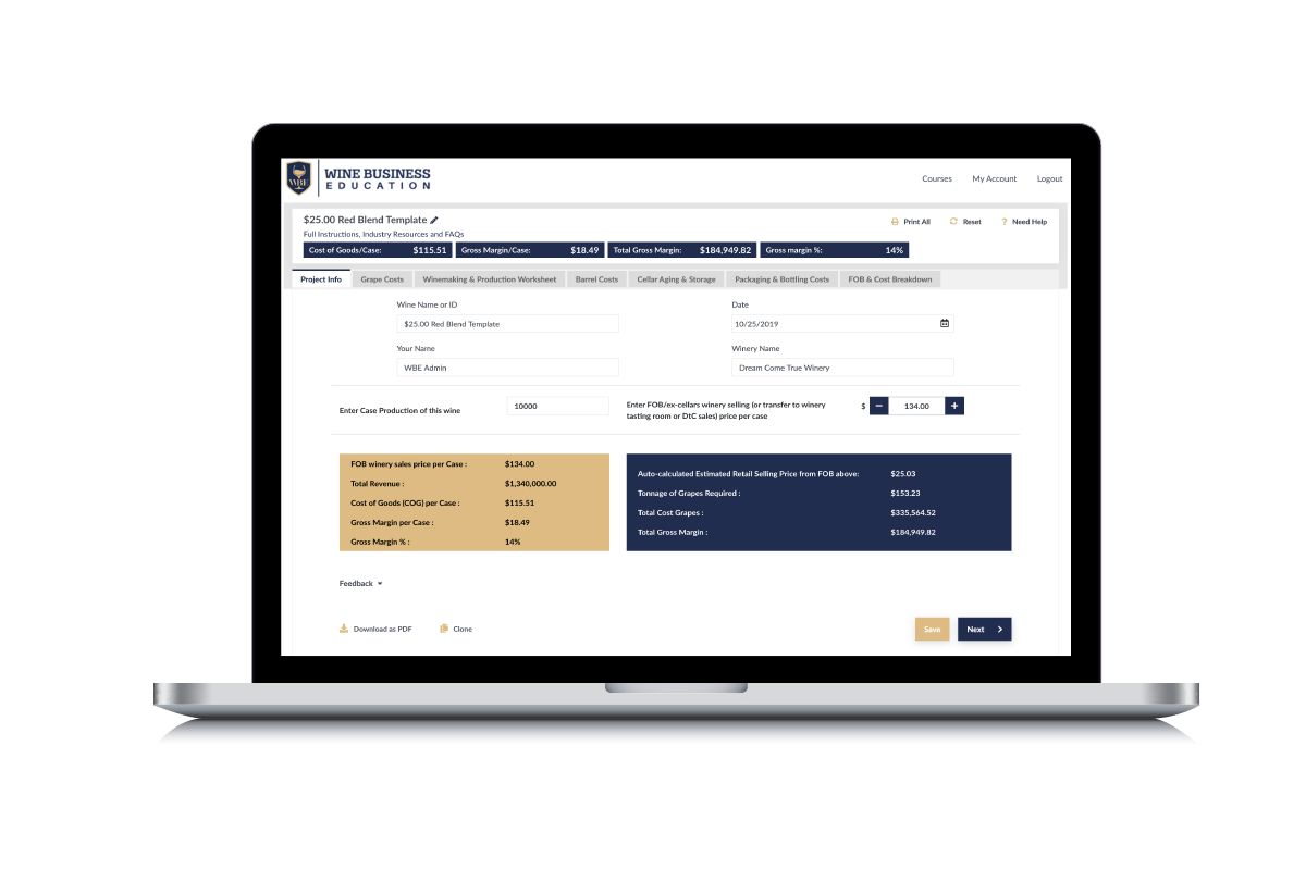 Your license includes a 1-year subscription to all six financial calculators. These are intended to simulate real-life wine business scenarios. Your annual license includes access to the following as well as any new calculators added during the course of your subscription: